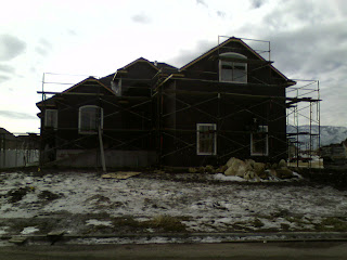 Finally, some something has happened on the exterior. The first pic is where they waterproof the house and put some foam around the windows for decoration. The second pic is the rough coat for the stucco. They put the color on yesterday, but I didn't get there soon enough to see it in the light.